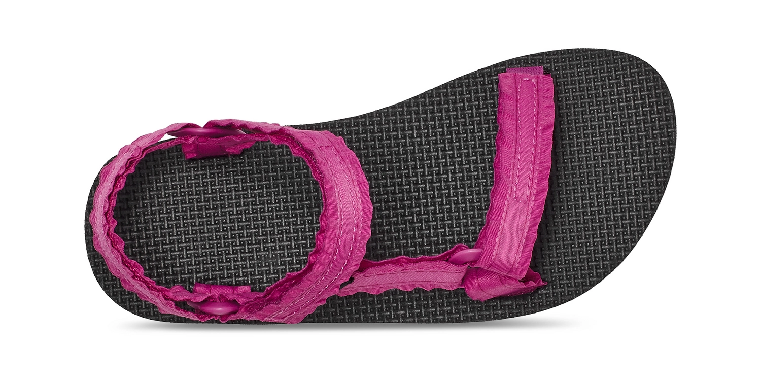 Deze sandaal komt uit de serie Original Universal Adorn van het merk Teva. De sandaal is afgewerkt met franjes en heeft hierdoor een lieve en speelse uitstraling. De sandaal heeft fijne en sneldrogende textiele bandjes van gerecycled polyester. De bandjes met klittenband sluiting zitten fijn op de huid en zijn gemakkelijk om aan en uit te trekken. Ze zijn op meerdere plekken te verstellen, zodat de kinderen altijd comfortabel in deze sandalen kunnen ravotten. Ze kunnen met deze sandalen zelfs door het water lopen, rennen en springen. De EVA zool met een antibacteriële laag biedt extra grip en optimale ondersteuning met een zachte demping.